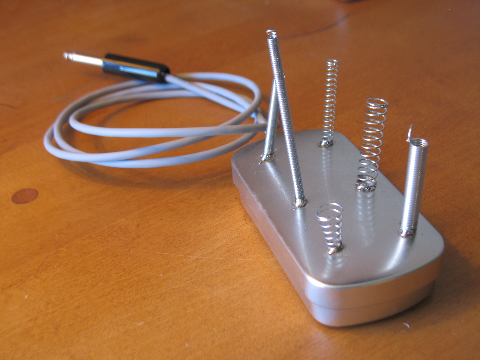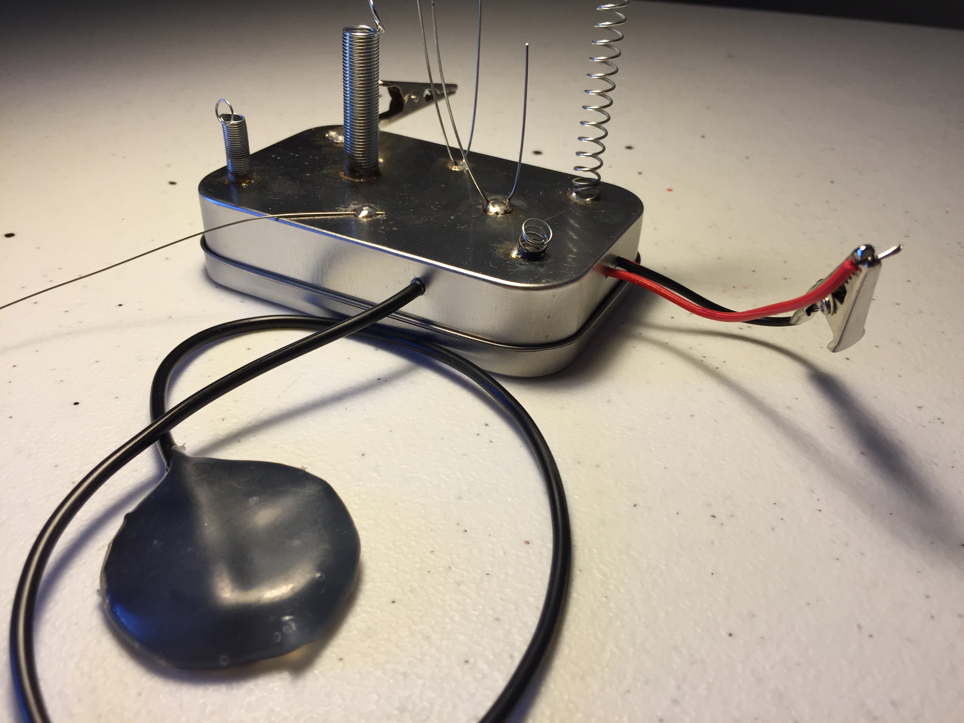 The Perpetual Spring Device is an instrument that consists of different sized steel springs mounted to a 4 inch x 2 inch tin (approximately the size of a breath mint tin). Mounted with a contact microphone and terminated to a four foot cable, you can plug it in* and pluck the springs, attack it with a violin bow, or add your favorite noise FX.