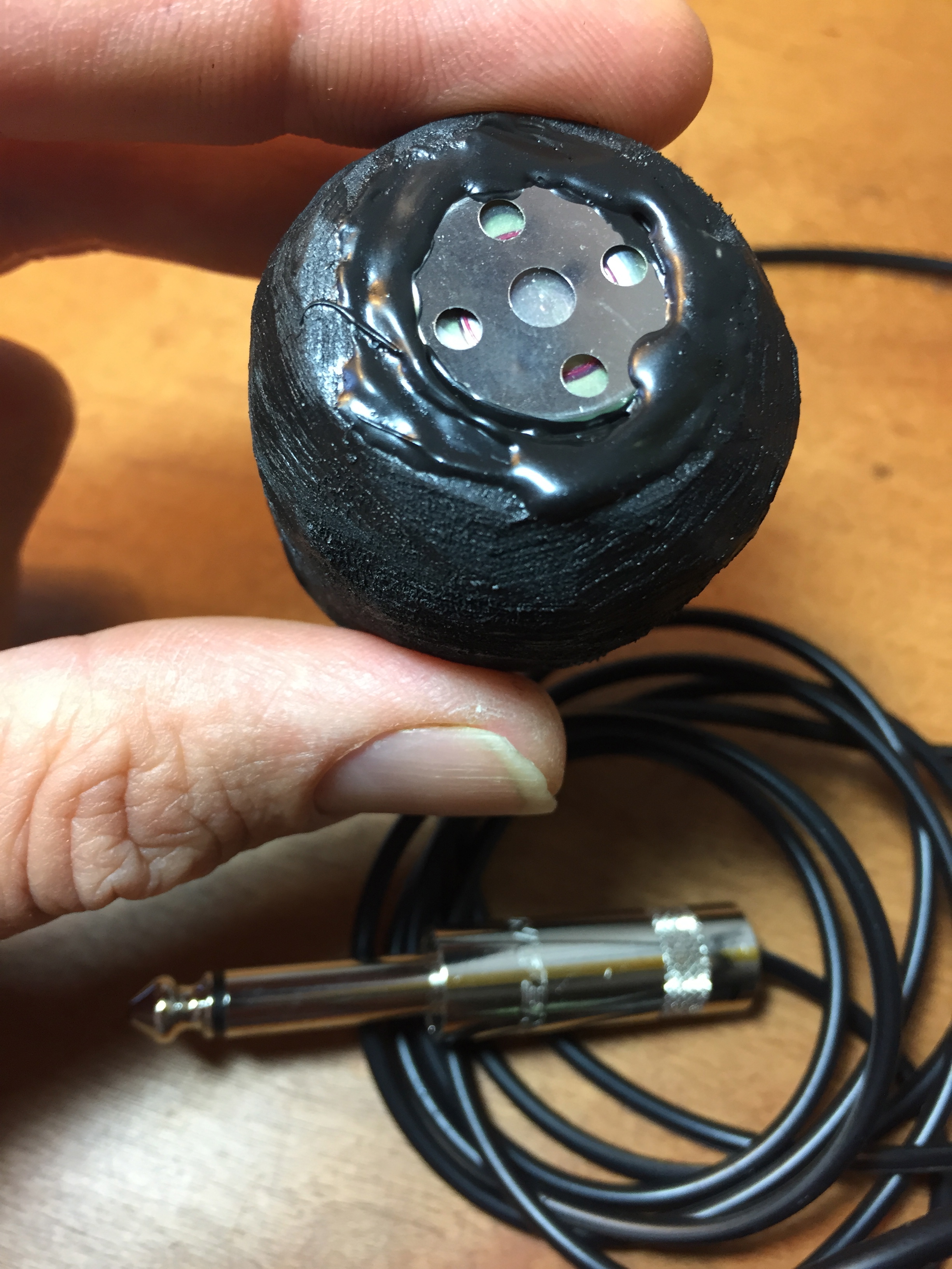 Want to submerge? Introducing the Immersion Sturgeon! It's essentially my Classic Contact Microphone*, but with an extra added layer of silicone "skin" on the microphone component. While not a true hydrophone (i.e., you won't hear any whales) the waterproofing allows the contact mic to be submerged, dragged through mud puddles, or served with mixed drinks (it sounds crazy-cool when dipped in club soda). The 4 foot cable provides enough wiggle room for aquatic experiments without getting your gear wet.
