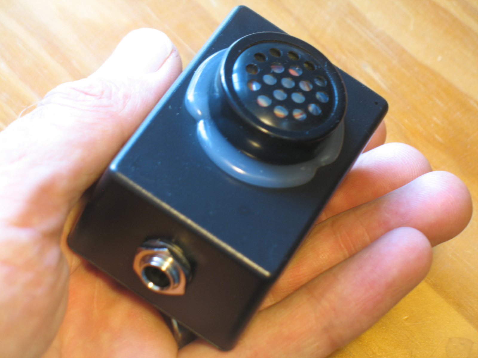 This microphone measures approximately 2.5 inches by 1.5 inches (6.35 cm by 3.81 cm), and is roughly 1 inch (2.54 cm) deep; it will fit nicely into the palm of your hand. The Barky is terminated to a standard 1/4 inch female jack (cable not included).