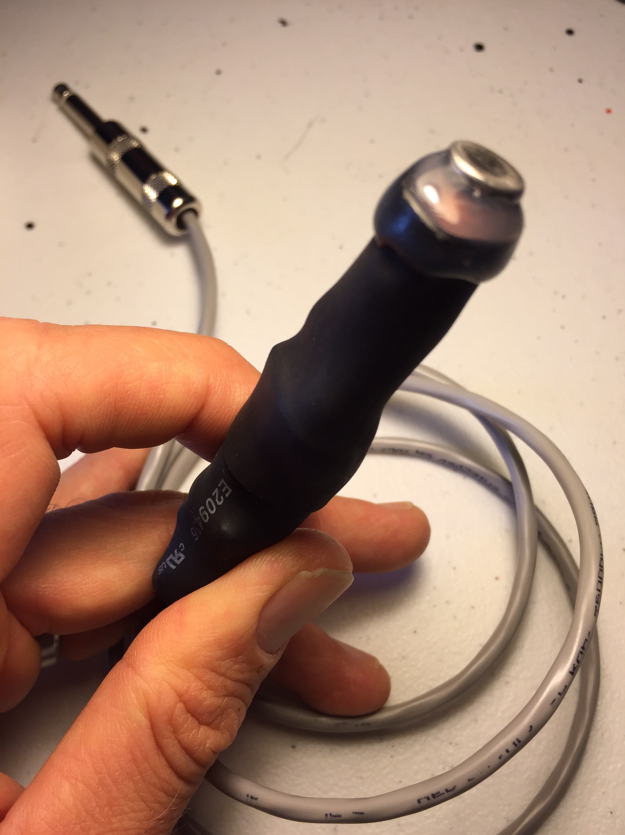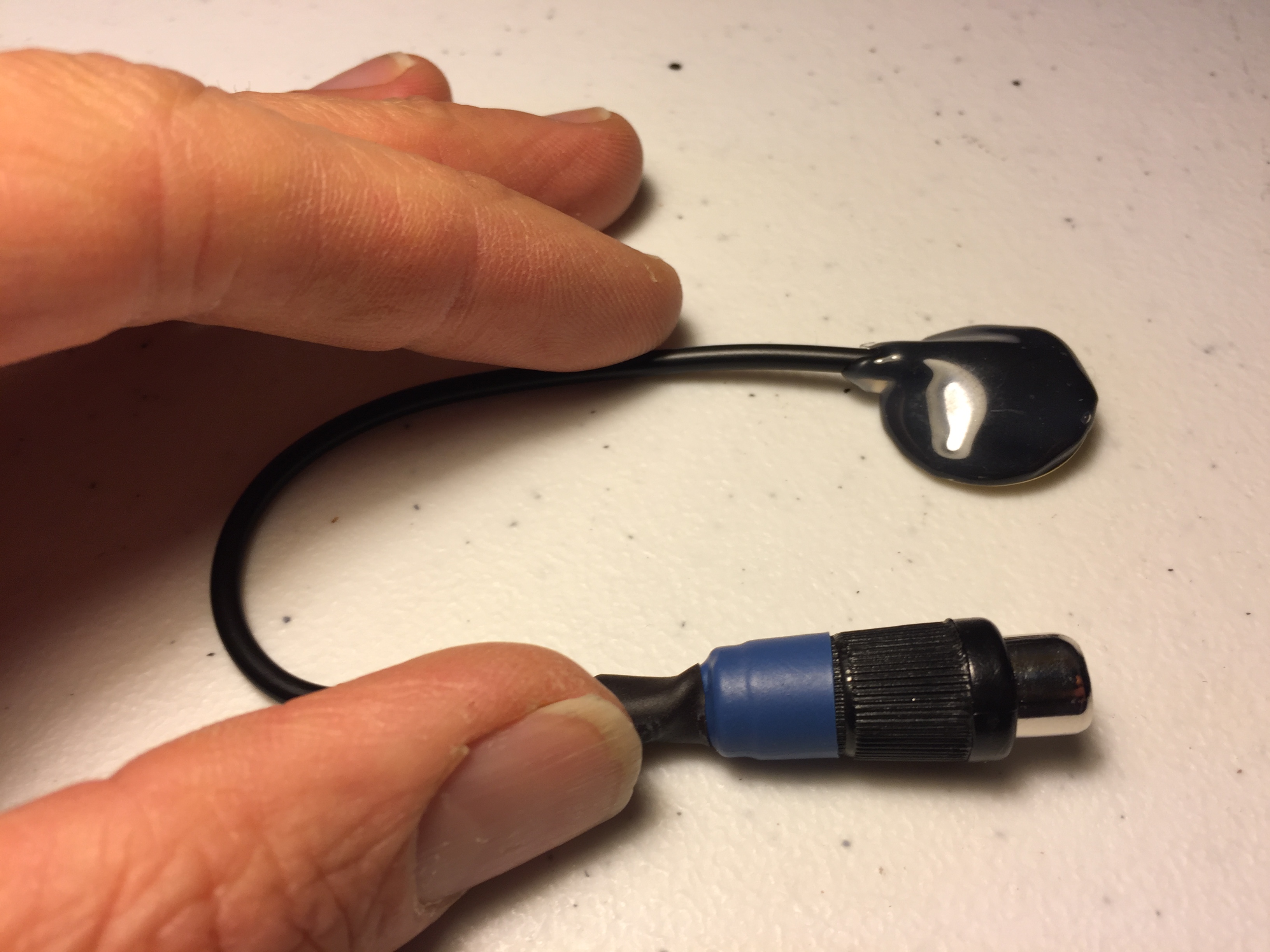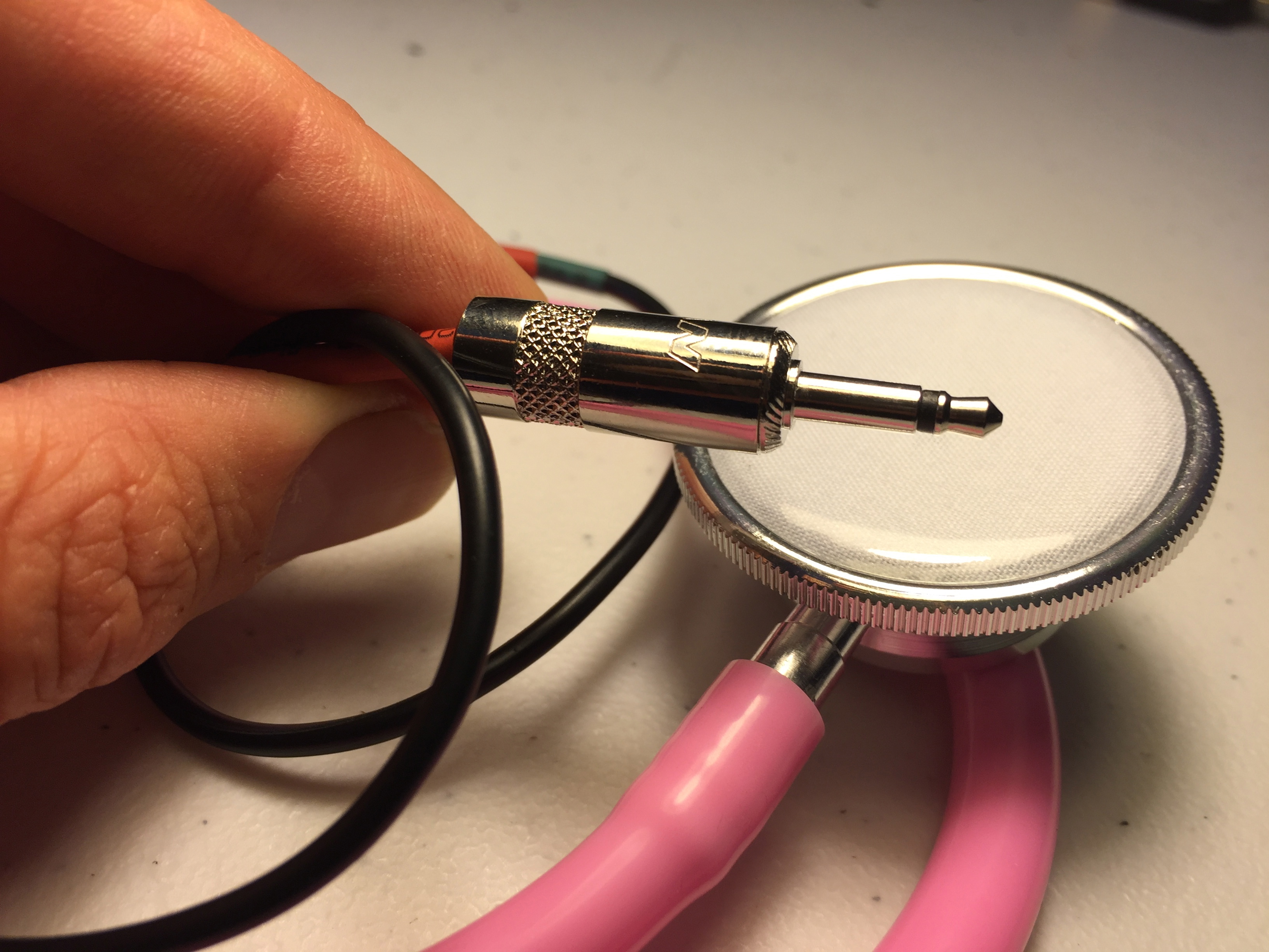 This is case with the Husoscope; it's a cool, lofi microphone, featuring a stethoscope head, roughly a yard's worth of wiggle room, and a mono 1/8 inch mini plug. The Husoscope is terminated to a tiny electret style microphone element (located inside the tubing), and works well in combination with microcassette recorders, portable cassette recorders (Walkman-style, not shoebox), certain digital dictaphones, and even on Euroracks (equipped with a 1u module). Please keep in mind that electret microphones require a tiny bit of voltage in order to work* (see below), and while a lot of "old school" recorders feature this with their mini-jack inputs, not every model does. Nevertheless, I've had pretty good results with a variety of recorders, as well as this clip (recorded on a digital Sony recorder).