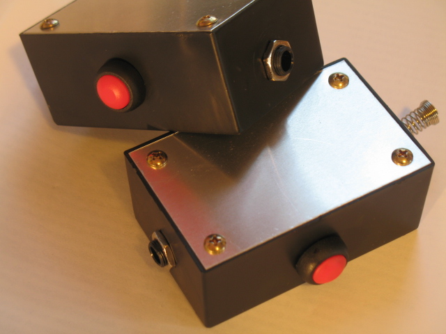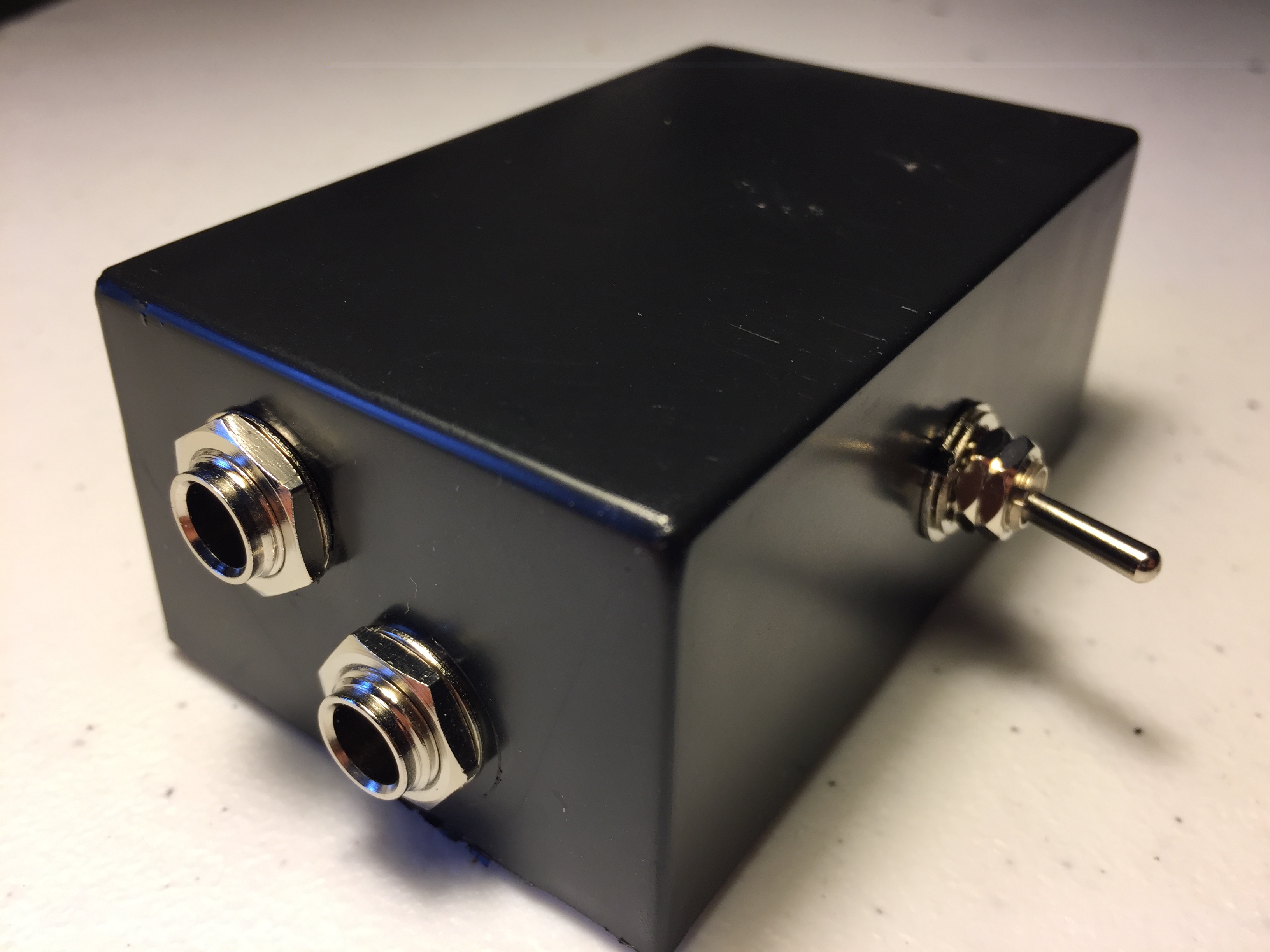 The Switch & Bait is a simple 2-to-1 switch box, redirecting two audio sources to one output with the flick of a switch. In addition to the toggle switch, I've added a momentary kill switch (that's the red button in the photos), which allows one to temporarily cut the audio signal to the output. Housed in a 3 x 2 x 1.5 inch plastic project box, it should be pointed out that the Switch & Bait is a passive switcher -- it does not require a battery or AC to work -- and as such, will not add gain or signal boost. Terminated with 1/4 inch female jacks, the box can be used in any duo-combination: pairing up microphones, tape players, FX, you name it.