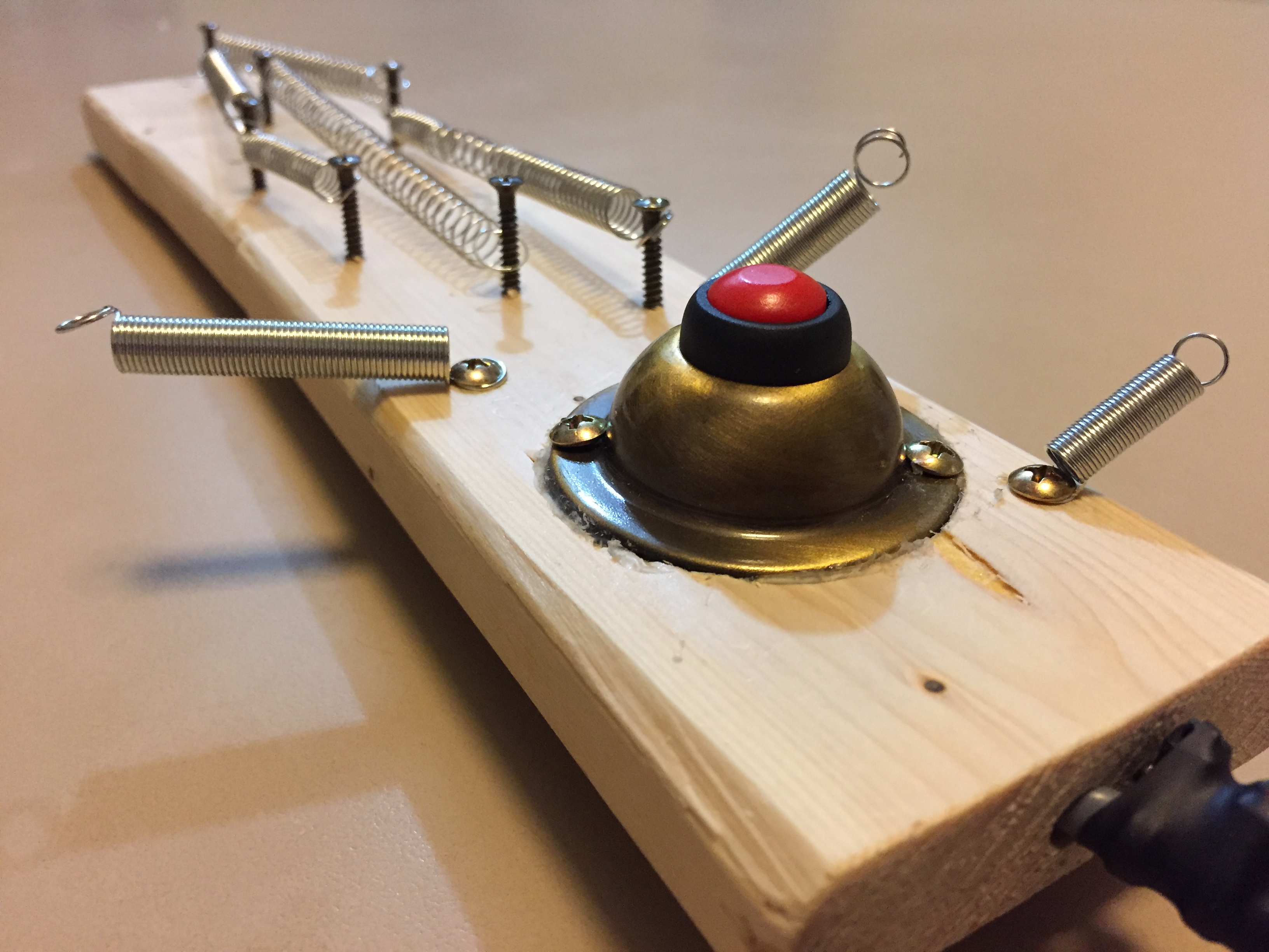 The Plank & Pluck is yet another hybrid of the Perpetual Spring Device. A handful of springs are bolted, mounted, and stretched across two small wooden slabs, joined by a door hinge. On their own, the springs resonate and shimmer when plucked, smacked, or bowed like a violin. Using the door hinge, the springs take on unusual metallic tones and timbres; plus, the hinge creaks and squeaks as well! Imagine the P & P as a mini-foley device: with its groaning hinge, reverberating springs, and red-button kill switch, it's a powerful addition to one's sonic noise set up and also a cool instrument when played clean and direct into an amplifier.